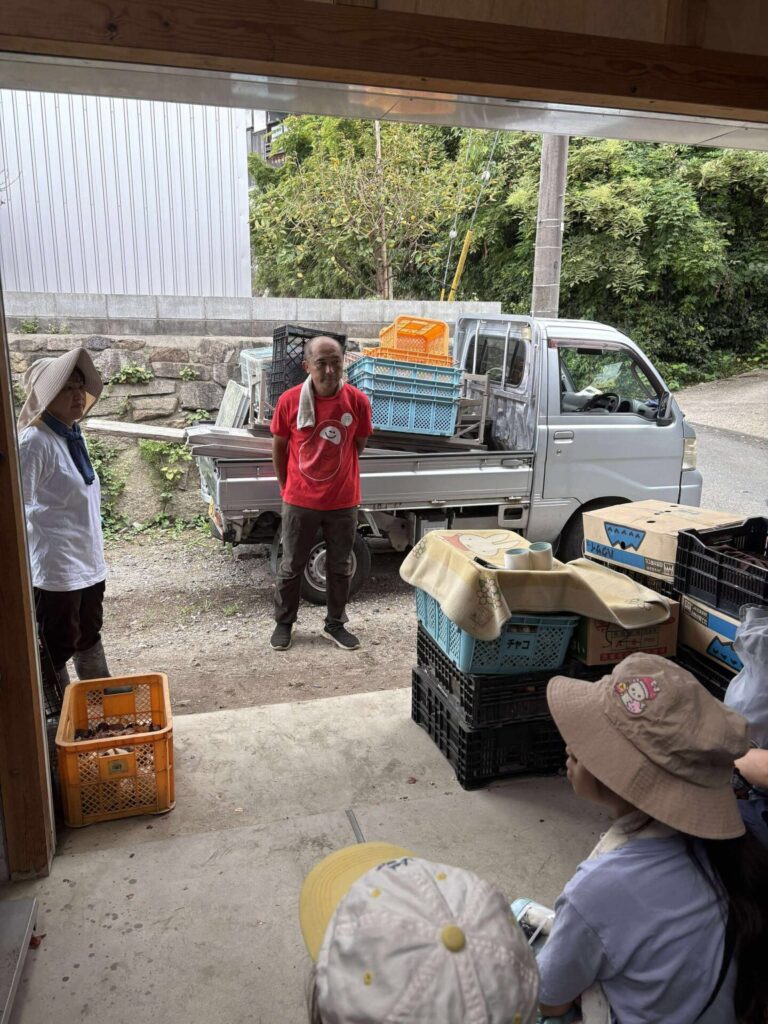 まずは作業場所で集合して、本日の流れをご説明いただきます。今回は、穂谷の里山を感じてもらえるように、徒歩で畑まで向かいますので、重い荷物は車で運んでもらいました。